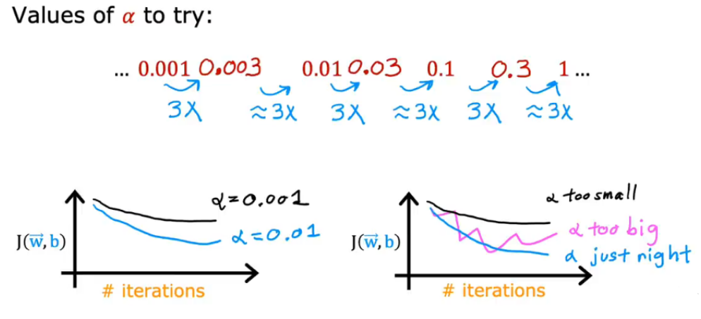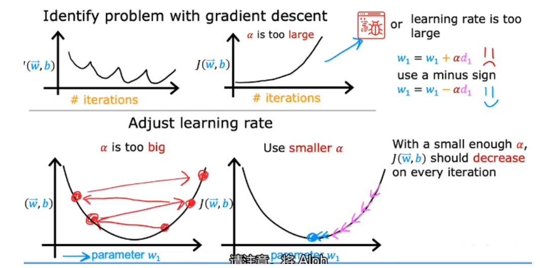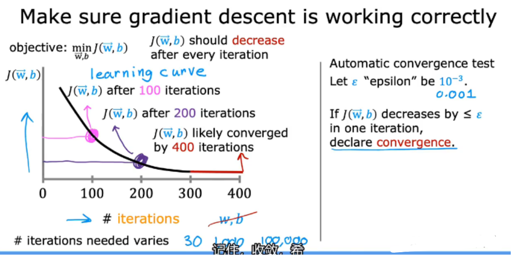验证梯度下降是否正常工作的一个好方法是看一下𝐽(𝑤,𝑏)的值。并检查它是否每一步都在减少