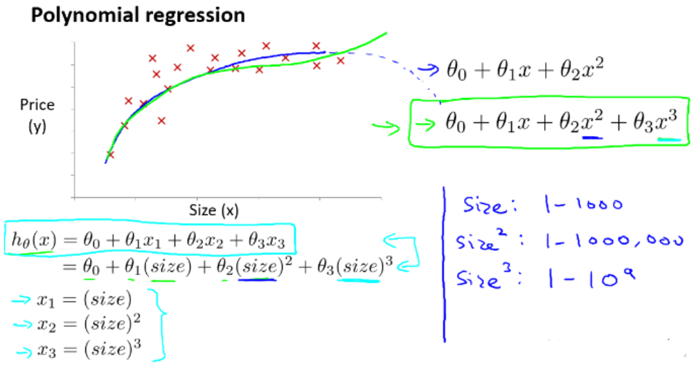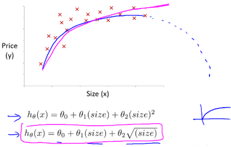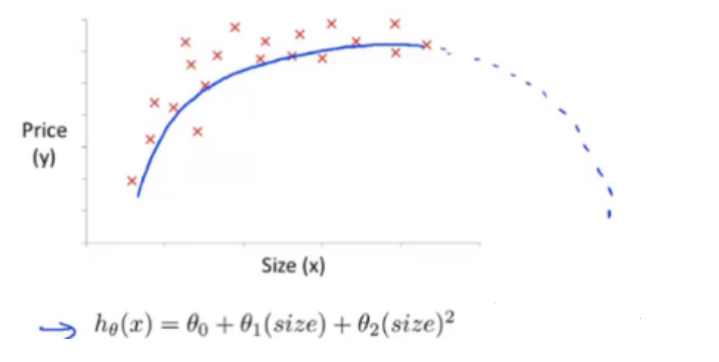 由于房价实际与面积挂钩,所以可假设x = x1 * x2,则有hθ(x) = θ0 + θ1x