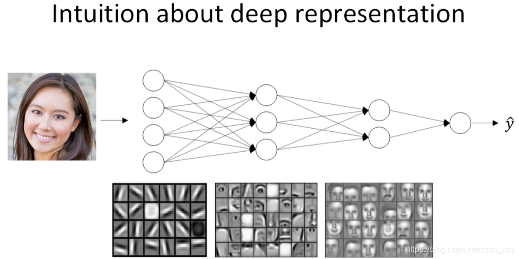 (提取特征的复杂度)首先,深度网络究竟在计算什么,如果你在建一个人脸识别或者人脸检测系统,深度神经网络所做的事情就是当你输入一张脸部的照片然后你可以把深度神经网络的第一层当成一个特征探测器或者边缘探测器。在这个例子中,创建一个大概有20个隐藏单元的深度神经网络,看如何针对这张图计算的,(1)隐藏单元就是这些图里这些小方块,我们可以把照片里组成边缘的像素们放在一起看,(2)然后它可以把被探测到的边缘组合成面部的不同部分,比如说,可能有一个神经元会去找眼镜,另外还有别的找鼻子的部分,然后把这许多的边缘结合在一起,就可以开始检测人脸的不同部分,(3)最后再把这些部分放在一起,比如眼睛鼻子下巴,就可以识别或探测不同的人脸了。边缘探测器其实相对来说都是针对照片中非常小块的面积,面部探测器呢就会针对大一些的区域,但是主要的概念是一般从小的细节人手(比如边缘),然后再一步步到更大更复杂的区域。