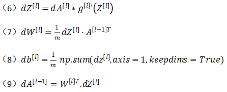 ① 正向传播(forward propagation):输入a^[l-1],输出a^[l],缓存变量是z^[l];从实现的角度来说我们可以缓存下w^[l]和b^[l],这样更容易在不同的环节中调用函数。