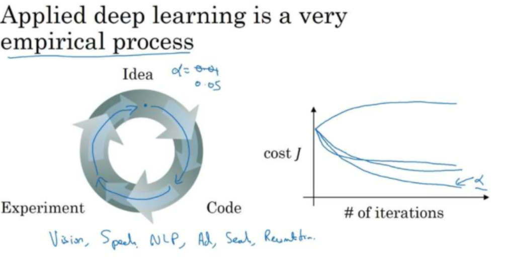 如何寻找超参数的最优值?走Idea—Code—Experiment—Idea这个循环,尝试各种不同的参数,实现模型并观察是否成功,然后再迭代。