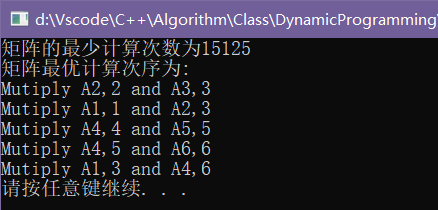 算法MatrixChain只是计算出了最优值,并未给出最优解.也就是说,通过MatrixChain的计算,我们只知道计算给定的矩阵连乘积所需的最少数乘次数,还不知道具体应按什么次序来做矩阵乘法才能达到数乘次数最少.