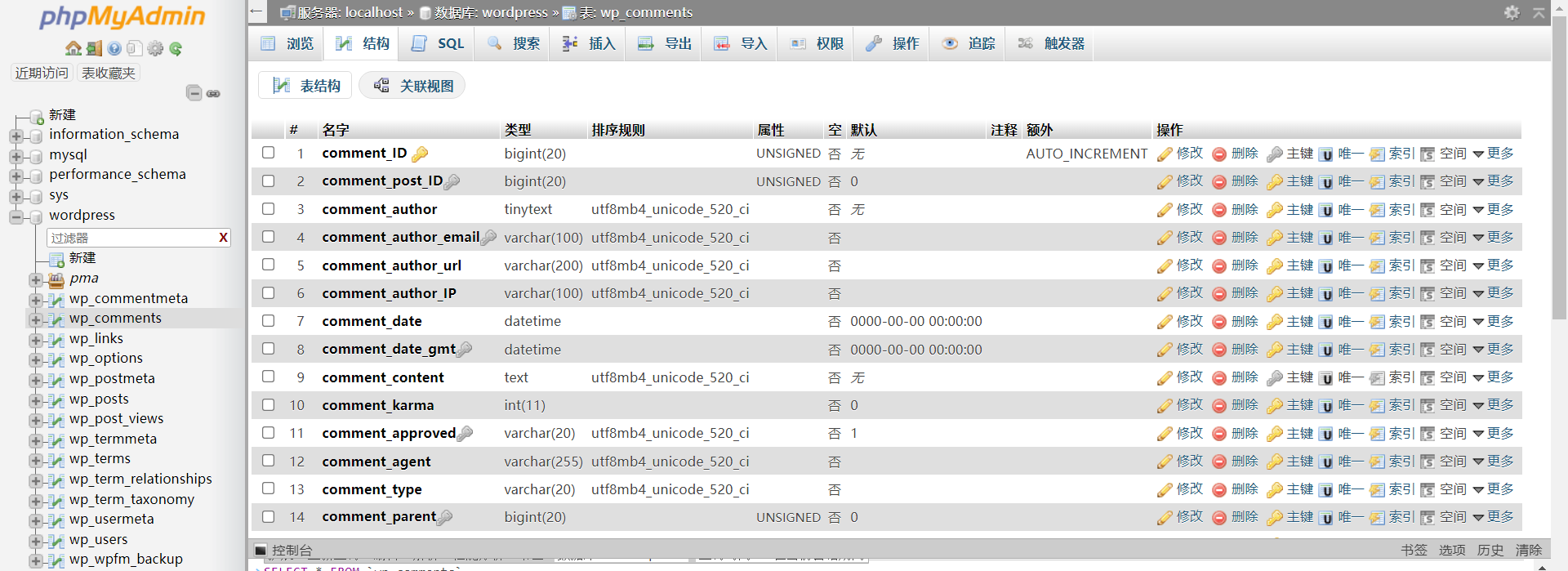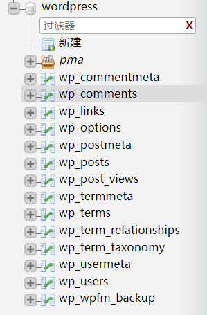 当我进入phpMyadmin准备看看wordpress数据库时候,我很快就发现没有了wp_comments这个数据表.