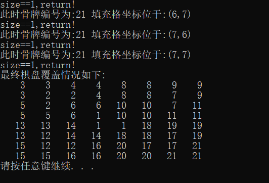 这里有一个问题,也是上课时老师问过我的一个问题,就是为什么当递归回来的时候,骨牌的编号还是保持一致的呢.