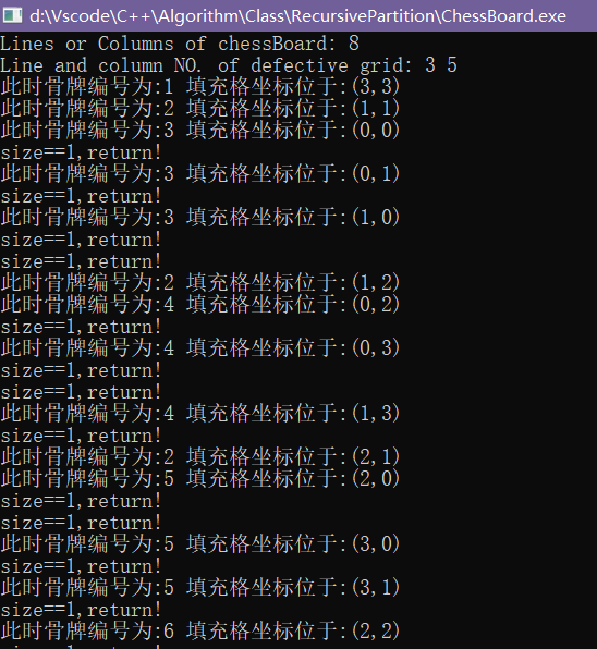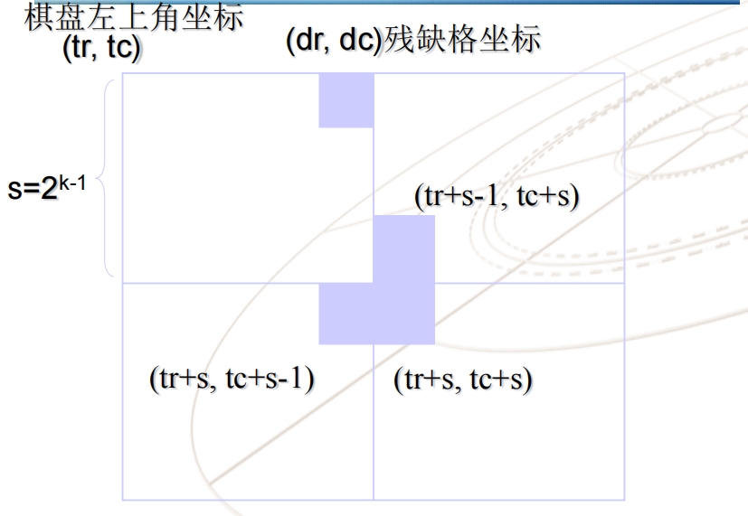 ChessBoard(tr, tc+s, tr+s-1, tc+s, s); //覆盖其余部分,棋盘左上角的坐标也要记得更改!