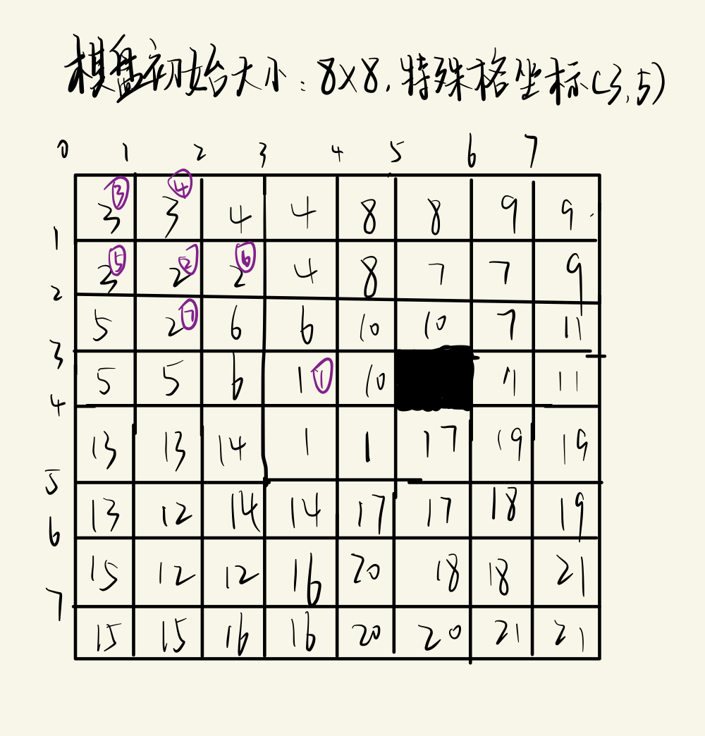 测试样例:棋盘大小 8x8, 特殊格坐标(3, 5)