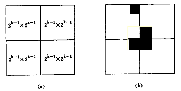 当k>0时,将2^k x 2k棋盘分割为**4个2(k-1) x 2^(k-1)子棋盘**, 残缺方格必位于4个子棋盘之一.