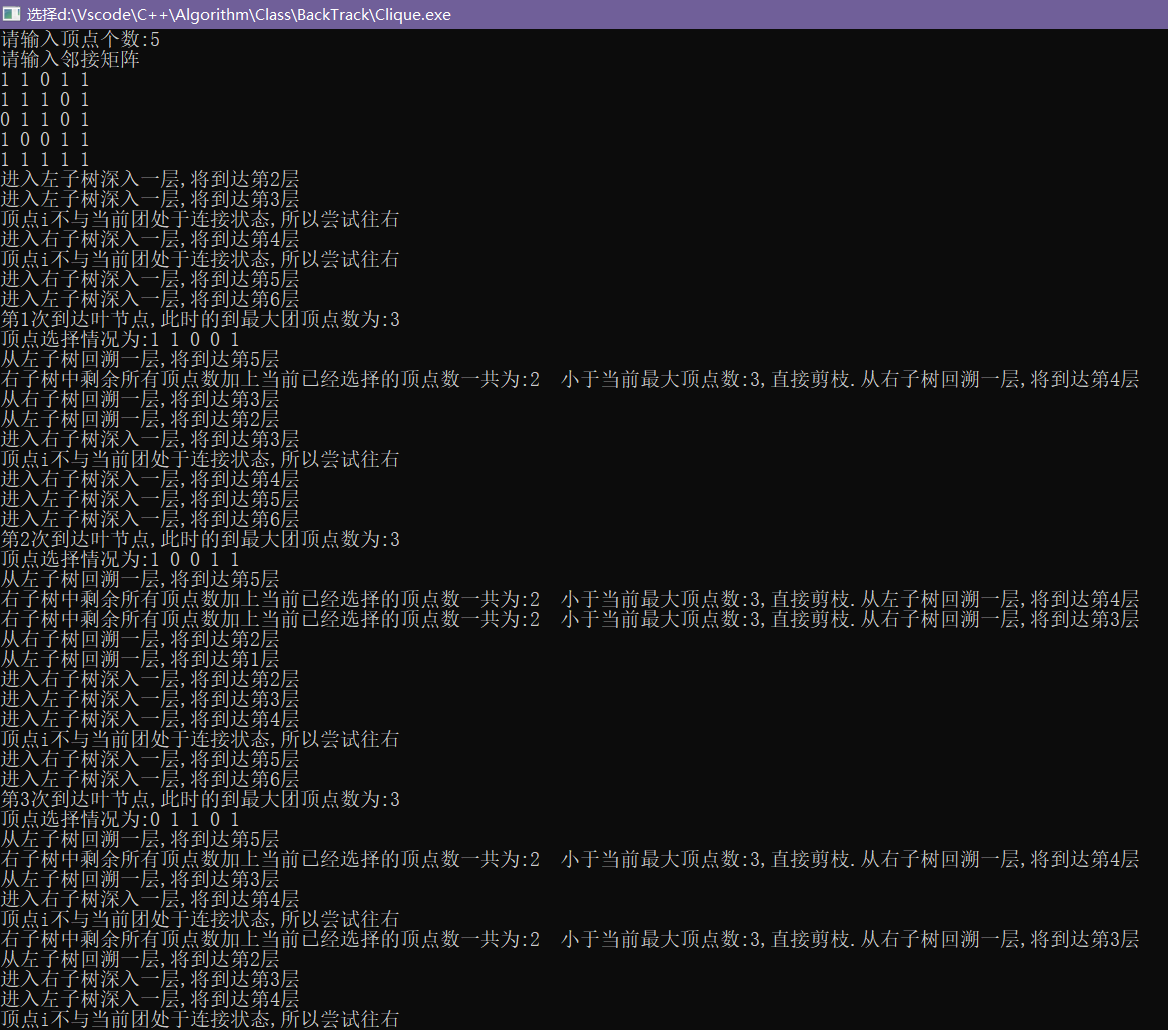 else cout<<"右子树中剩余所有顶点数加上当前已经选择的顶点数一共为:"<<cn+n-i<<" 小于当前最大顶点数:"<<bestn<<",直接剪枝.";