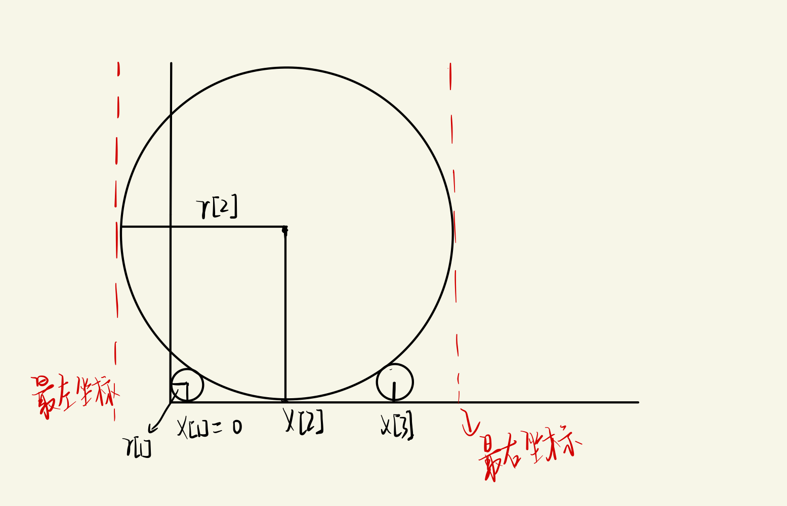 同样的,0也不是最左的坐标(当r[m] - x[m] = r[1]时,就是选定了第一个圆,则x[1]=0).