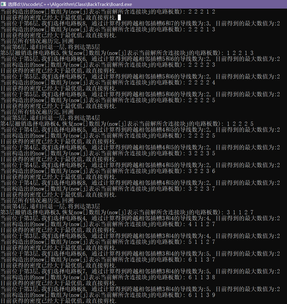 void Board::Backtrack(int i, int cd) //回溯搜索排列树,cd表示已经确定的x[1:i]个插槽中相邻两个插槽被跨越数最大的(就是密度)