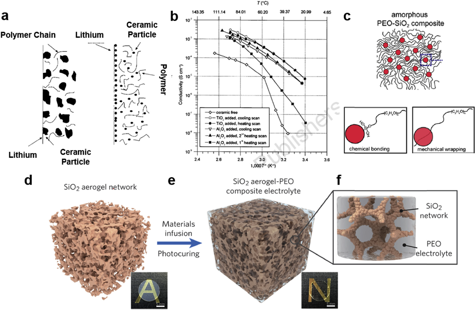 在20世纪80年代后期,研究人员报告说,添加精细陶瓷填料(直径范围从亚微米到几微米)增强了CSSEs的离子电导率,如图2b。小颗粒的加入增加了聚合物/盐非晶相的体积分数,导致离子电导率相应提高。然而,粒子的非原位添加量低至几纳米时通常会导致纳米粒子的聚集。这种团聚不允许充分利用纳米粒子的大表面积并导致出现残留的结晶聚合物区域。