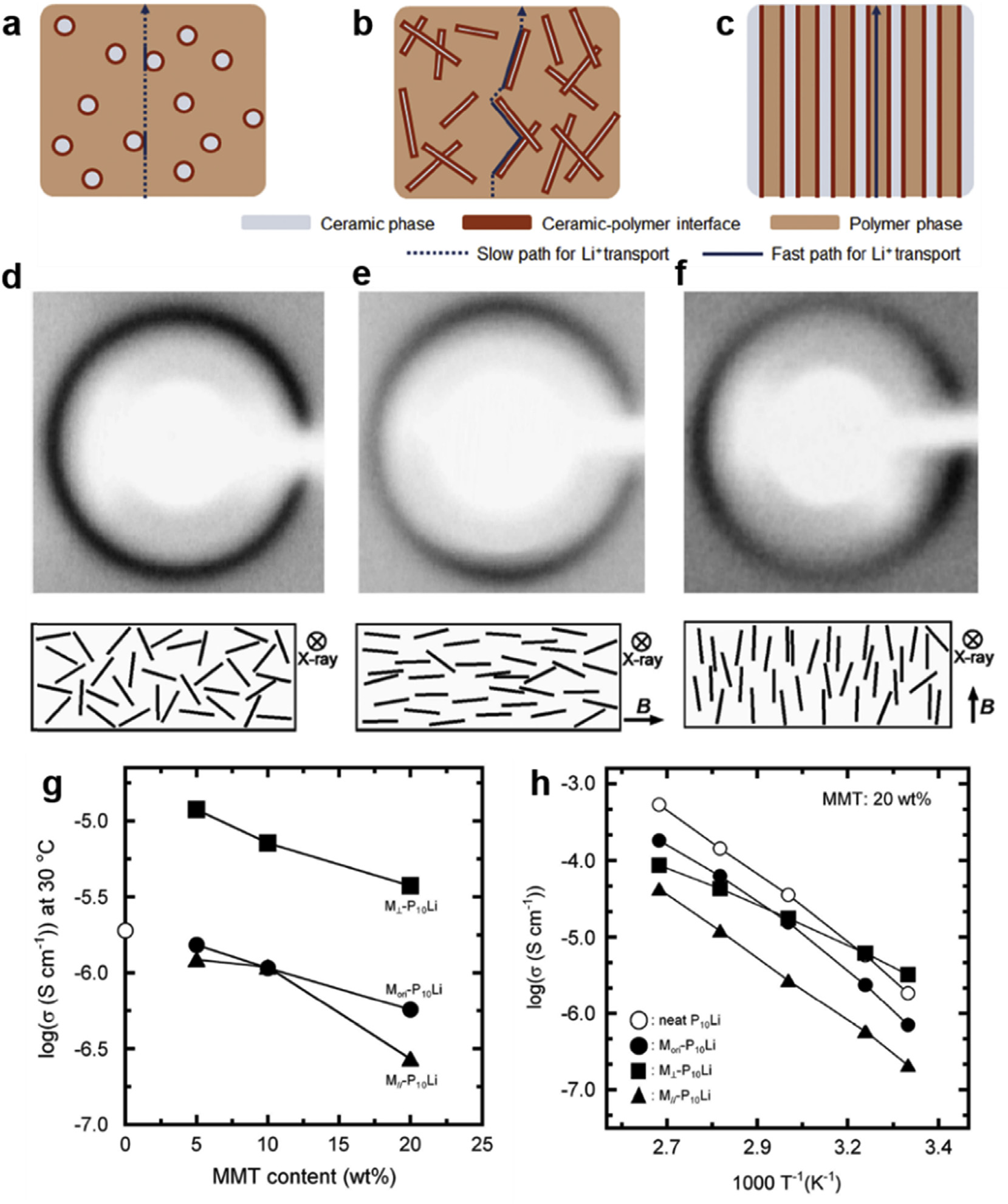 Kitajima等人在PEO/LiClO4中引入磁性取向的二维蒙脱土(MMT)陶瓷板,用来形成不同取向的CSSEs,如图4d-f。尽管通过对电导率的测量可以发现垂直排列对离子电导率的增强效果,但与其他CSSEs相比,垂直排列的MMT CSSEs的总离子电导率不高,如图4g和h。