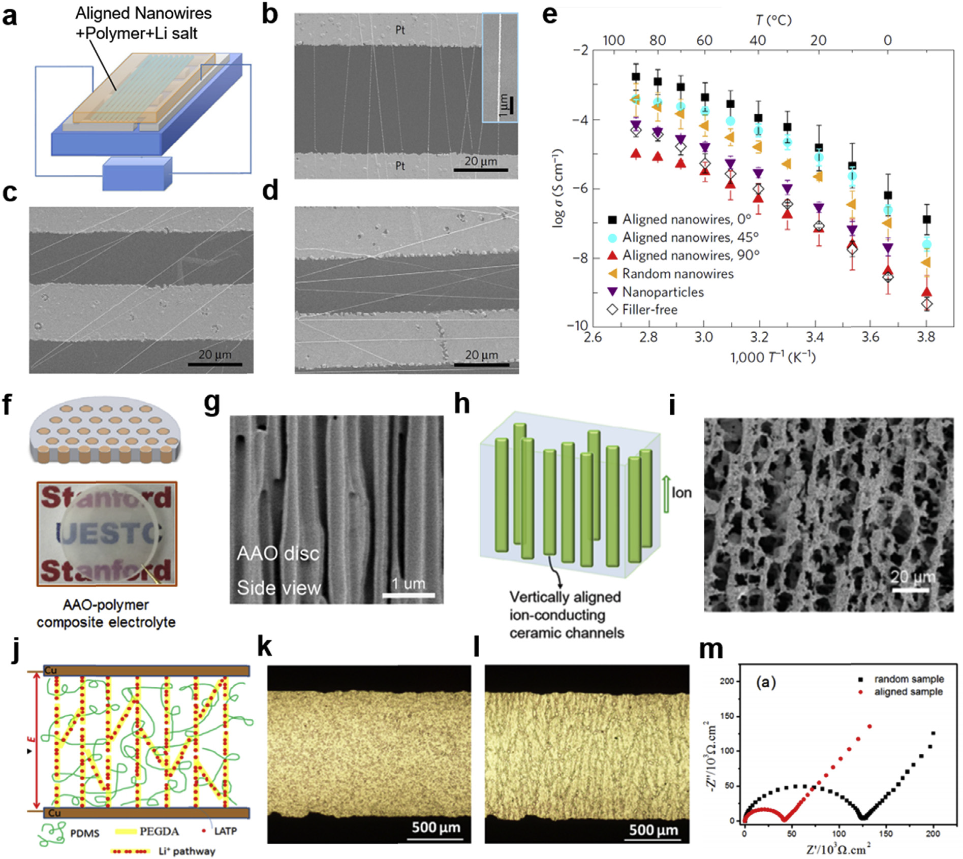 为了证明连续排列填料的增强效果,Liu等人测量了在PAN/LiClO4CSSEs中以不同取向存在的LLTO纳米纤维的离子导电率(如图5a-d)。与宽度温度范围内的无填料聚合物电解质相比,连续排列的LLTO纳米线在所有方向中显示出最高的电导率和两个数量级的增强(图5e)。这项工作表明了对齐的CSSEs的连续界面的重要性。除此之外,文中又系统讨论了添加连续排列填料的CSSEs近期的一些研究进展,如图5f-m。同时作者总结出:不太曲折,连续的活性无机/有机界面网络将有益于CSSEs的离子电导率。这可以通过创建连续的3D无机添加剂支架或良好的无机网络来实现。