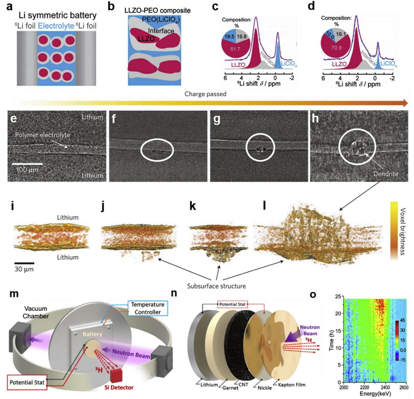 由于“锂”是一种轻元素,因此使用常规表征技术进行探测具有挑战性。因此,更先进的材料表征方法,如核磁共振(NMR)光谱,同步辐射X射线和中子散射技术,被用来理解ASSLBs的行为。目前,以上提到的几种高级表征方法已经在以下几个方面得到了实际的应用:①高分辨率固态NMR来表征具有LLZO填料的CSSEs的Li离子传输机制;②使用7Li NMR测量来检测交联聚(四氢呋喃)(xPTHF)/LiTFSI聚合物电解质体系中松散的O-Li +配位;③使用X射线断层摄影术观察固体聚合物电解质存在下的Li沉积; ④在LLZO SSEs存在下进行Li沉积的原位中子深度剖析测量。