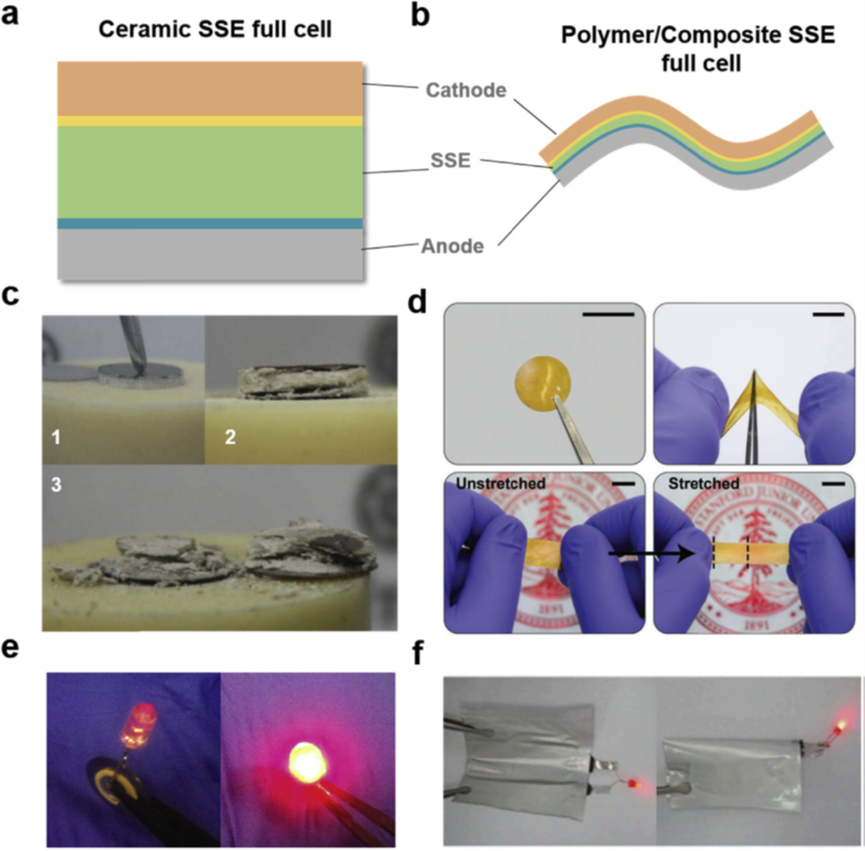 用SSEs代替液体电解质代表了锂电池的主要结构/组分变化。因此,SSEs与全电池的可加工性和相容性是任何类型SSEs可用性的两个主要问题。厚的刚性陶瓷膜抑制了整个电池的柔性。而灵活的CSSEs易于制造/处理,并与最先进的锂离子电池技术兼容。事实上,已有研究证明ePPO CSSEs甚至可以承受穿刺和拉伸等测试。具有全电池配置的CSSEs袋型电池由于具有较好的灵活性,即使弯曲或折叠也可以继续正常工作。但是,CSSEs仍然存在问题,例如电解质厚度仍然是陶瓷SSEs和基于CSSEs的电解质的问题。由于SSEs的类型比典型的液体电解质/分离器系统重得多,因此担心它们的实施可能会导致能量密度降低。