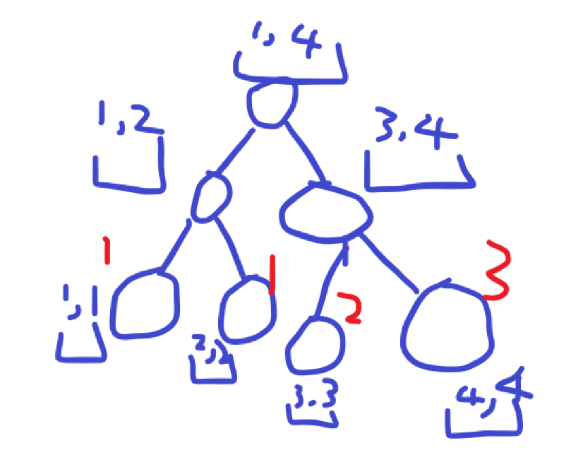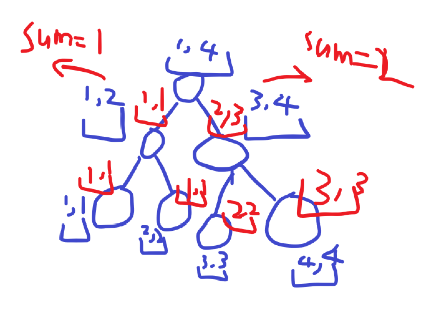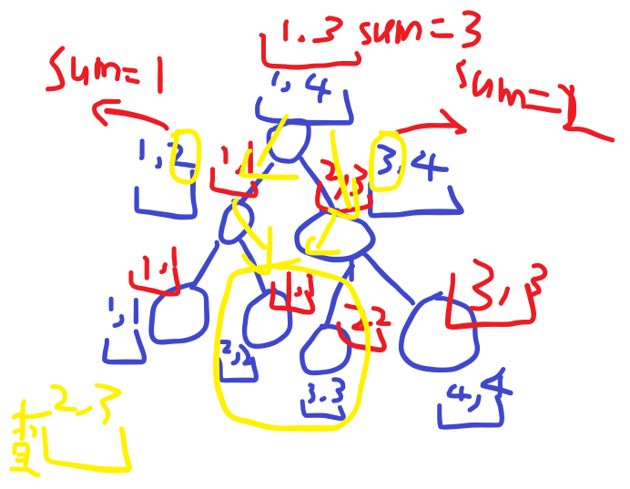 但是如果查询[2,3]你[1,2]区间的sum没有用力只能找到画黄圈的两个节点,如果根节点的左儿子のrc and 右儿子のlc 相同 查询值--;(对应图中[1,2]和[3,4]的小黄圈)