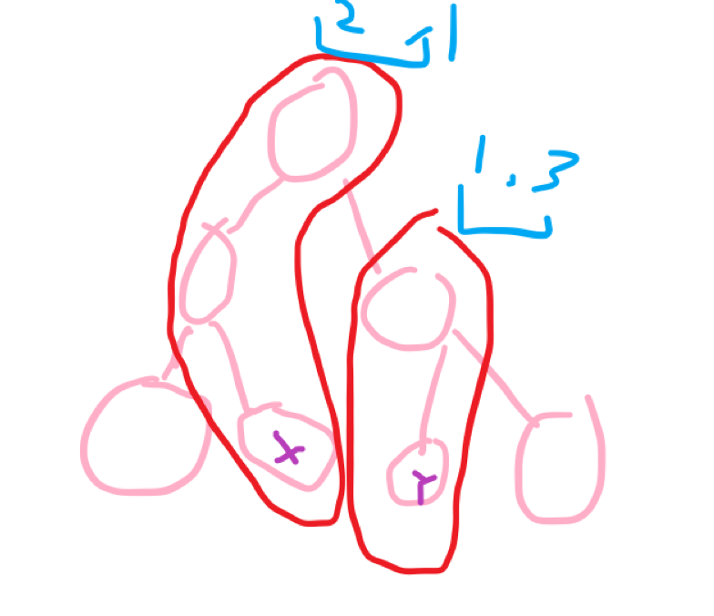 inline int qsum(int x,int y){ int arcaea(0),aa(0),bb(0); while(top[x]!=top[y]){ if(in[top[x]]<in[top[y]]) { swap(x,y); } aa=asksinglecolor(1,in[top[x]],in[top[x]]);//浅重链顶部的颜色 bb=asksinglecolor(1,in[f[top[x]]],in[f[top[x]]]);//浅重链顶部的父亲节点颜色 arcaea+=askrangecolor(1,in[top[x]],in[x]); if(aa==bb) arcaea--;//如果相同就减一 避免了上图的情况出现 x=f[top[x]]; } if(in[x]>in[y]){ swap(x,y); } arcaea+=askrangecolor(1,in[x],in[y]); return arcaea; }