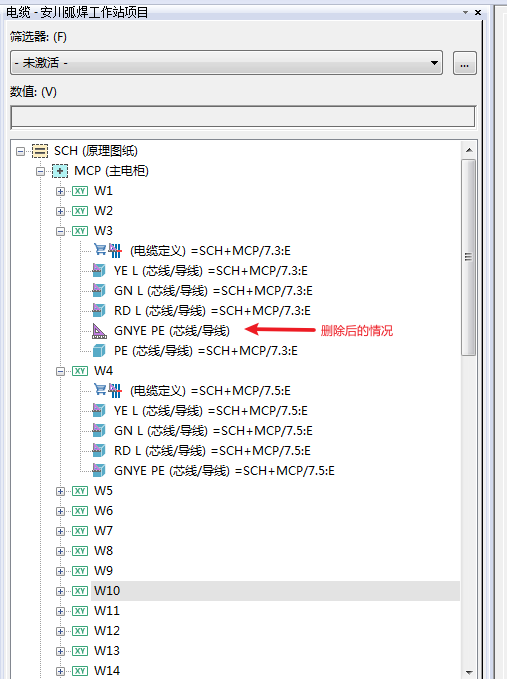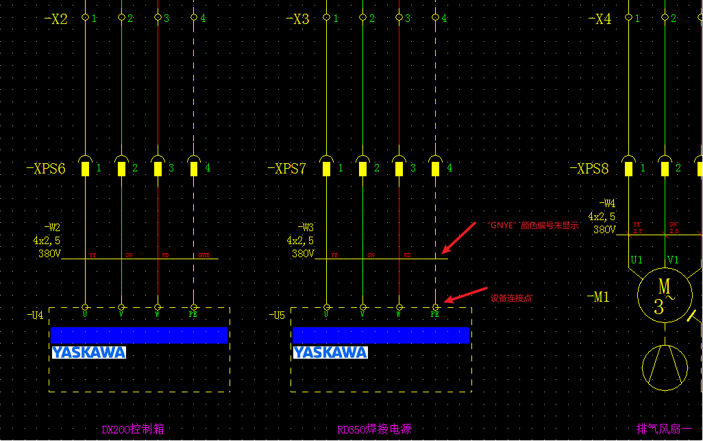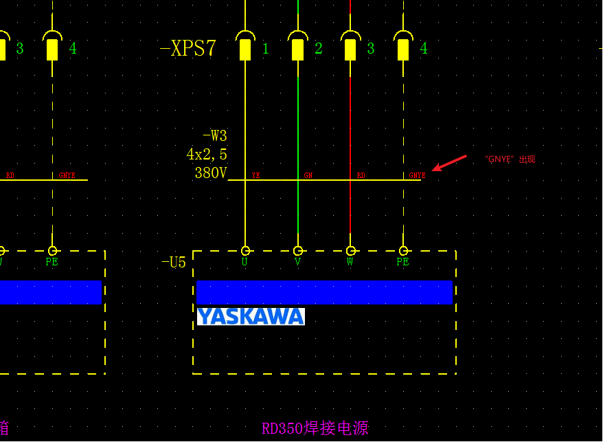图9 电缆定义重新放回原位置后“GNYE”显示出来(若没有出来将电缆定义移开,更新项目后再移回来即可)