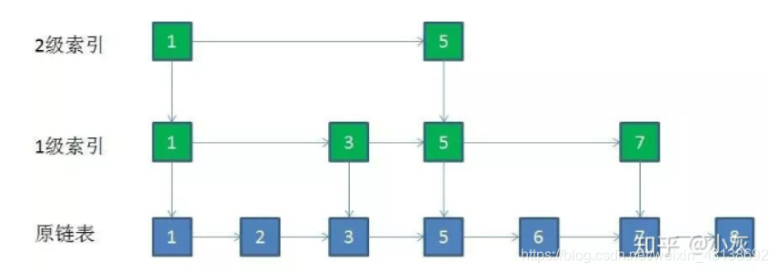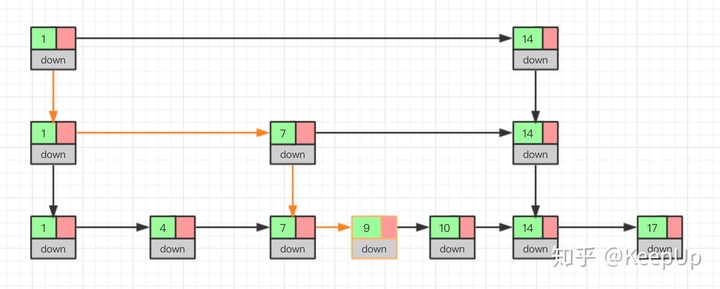 5)、每个节点包含两个指针,一个指向同一链表中的下一个元素,一个指向下面一层的元素。