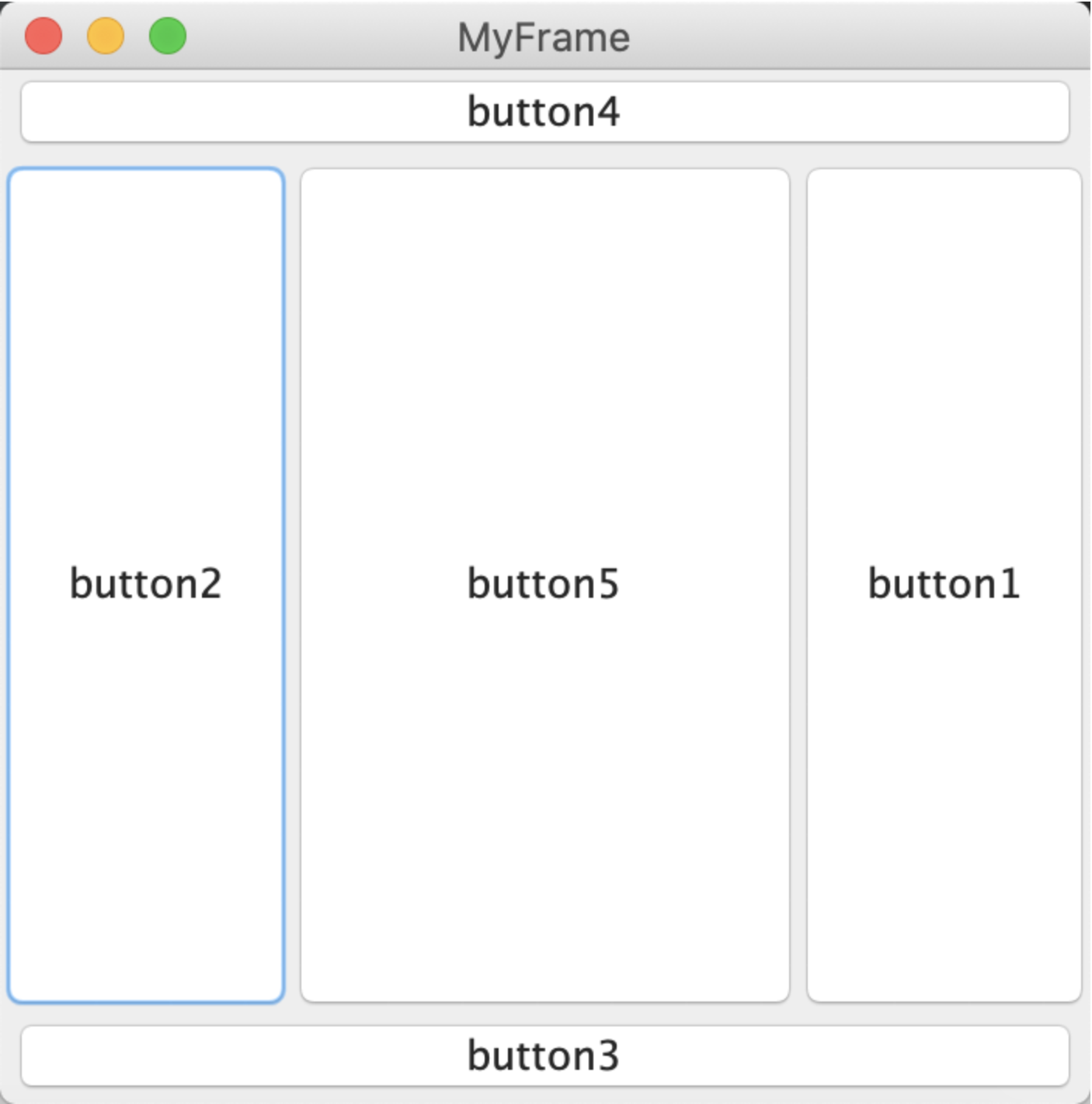 public static void main(String[] args) { Frame frame = new Frame("MyFrame"); frame.setBounds(100, 100, 500,500); //设置流式布局 frame.setLayout(new BorderLayout()); Button button1 = new Button("button1"); Button button2 = new Button("button2"); Button button3 = new Button("button3"); Button button4 = new Button("button4"); Button button5 = new Button("button5"); frame.add(button1, BorderLayout.EAST); frame.add(button2, BorderLayout.WEST); frame.add(button3, BorderLayout.SOUTH); frame.add(button4, BorderLayout.NORTH); frame.add(button5, BorderLayout.CENTER); frame.setVisible(true); }