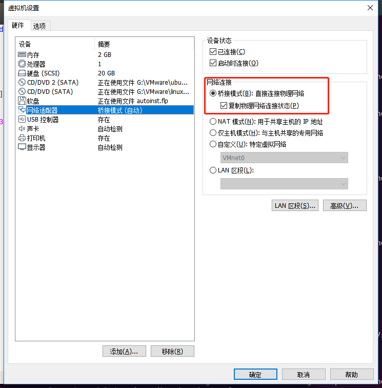 还有一点就是虚拟机的设置,如下所示,如果想要设置回原来的网段,可以用上面那个链接写的动态IP,改好后,用sudo netplan apply执行再使用命令ifconfig即可看到IP发生变化。