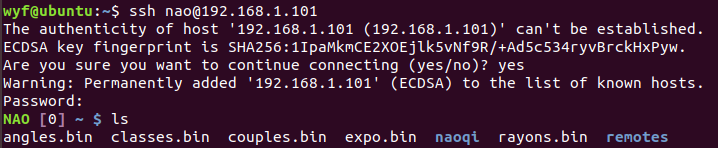 修改好了之后我们可以先用 ssh 连接访问一下nao机器人看看通不通,执行以下命令: