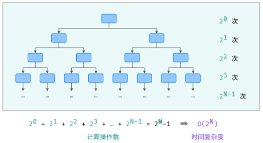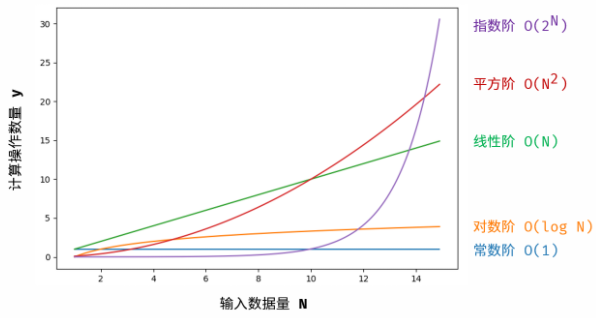 时间复杂度指输入数据大小为 N 时,算法运行所需花费的时间。统计的是算法的「计算操作数量」,而不是「运行的绝对时间」。因为算法运行时间受到「编程语言 、计算机处理器速度、运行环境」等多种因素影响。