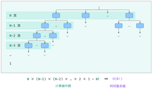 阶乘阶对应数学上常见的 “全排列” 。即给定 N 个互不重复的元素,求其所有可能的排列方案,则方案数量为:N×(N−1)×(N−2)×⋯×2×1=N!