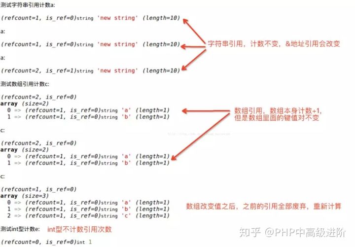 注意:从PHP7的NTS版本开始,以上例程的引用将不再被计数,即$c=$b=$a之后a的引用计数也是1.具体分类如下: