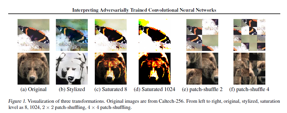 惊奇的发现,对抗训练的网络减轻标准神经网络对纹理偏重(texture bias),依靠ImageNet训练的标准CNNs,其预测更依赖于局部纹理特征,而不是广域的物体形状特征。还帮助CNNs 学习了一个偏向于形状的表示(shape-biasd representation)。