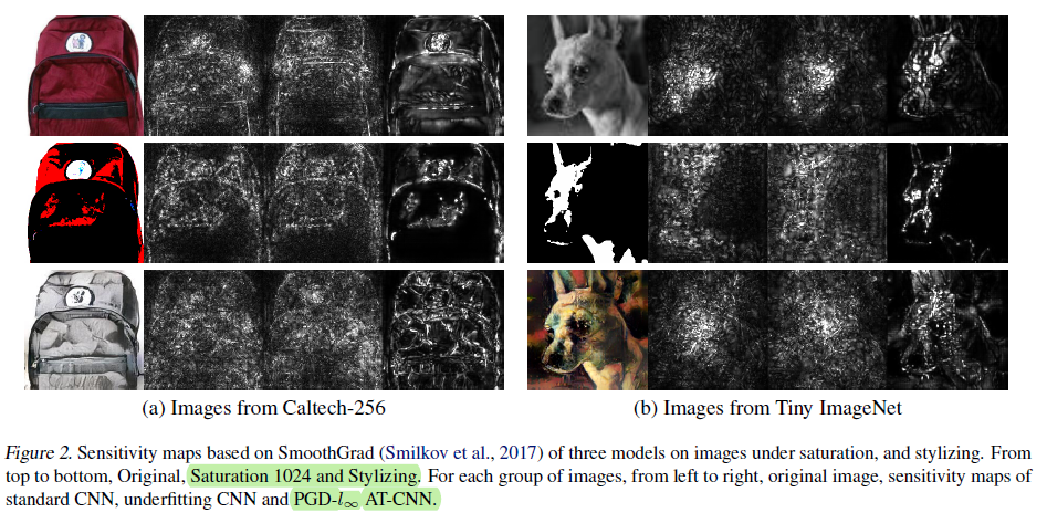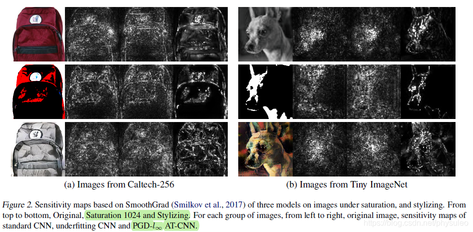 这是基于SmoothGrad的敏感度图,从左至右:原图,标准CNN的敏感图,欠拟合的敏感图和PGD- AT-CNN。