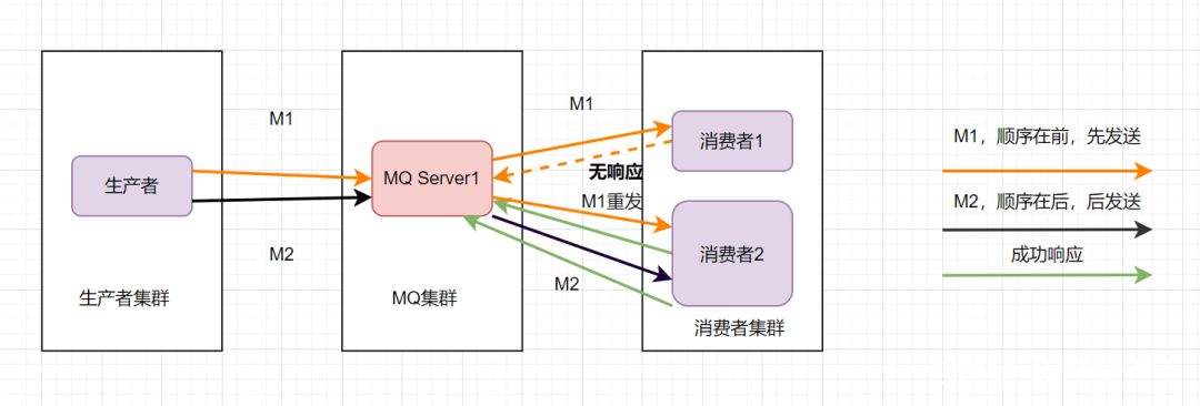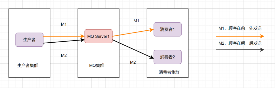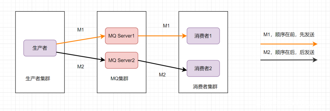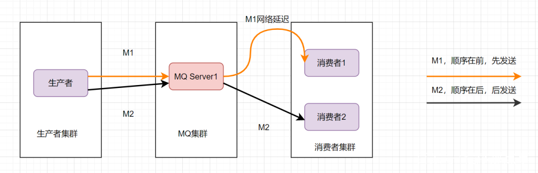 这样还是可能会有问题,因为从MQ服务器到消费端,可能存在网络延迟,虽然M1先发送,但是它比M2晚到。