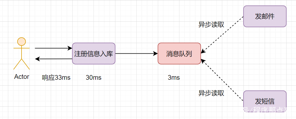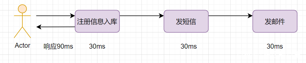 如果注册信息入库是30ms,发短信、邮件也是30ms,三个动作串行执行的话,会比较耗时,响应90ms: