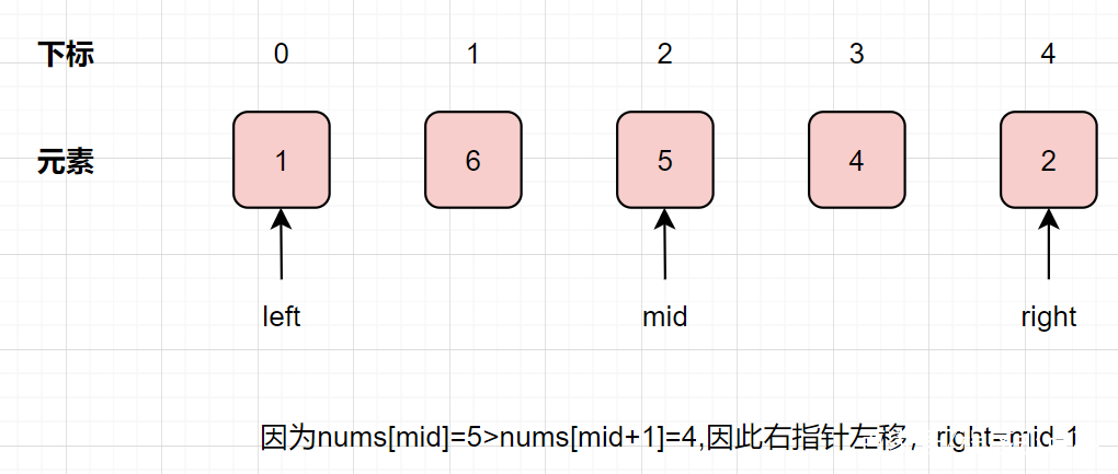- 如果中间元素大于其下一个元素大小,证明最大值在左侧,因此右指针左移