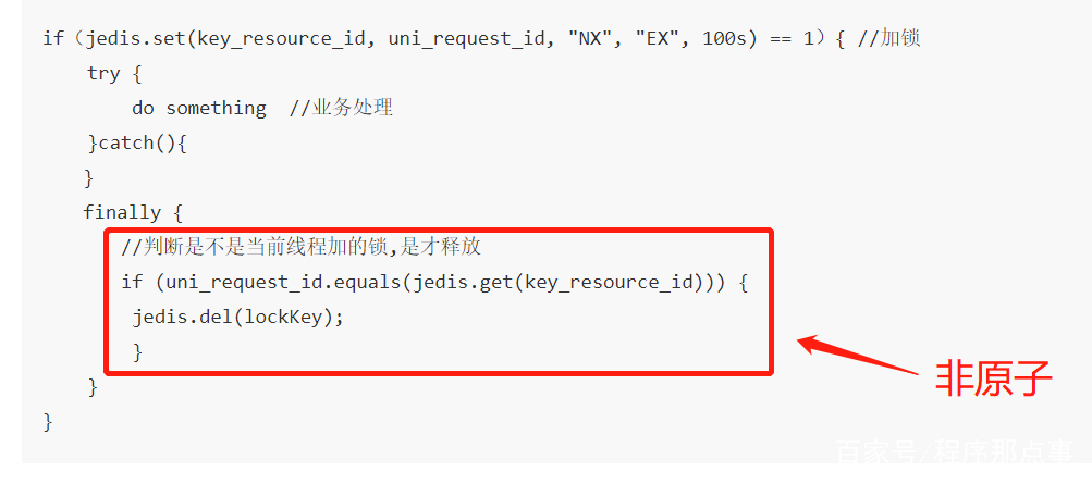 在这里,判断是不是当前线程加的锁和释放锁不是一个原子操作。如果调用jedis.del()释放锁的时候,可能这把锁已经不属于当前客户端,会解除他人加的锁。