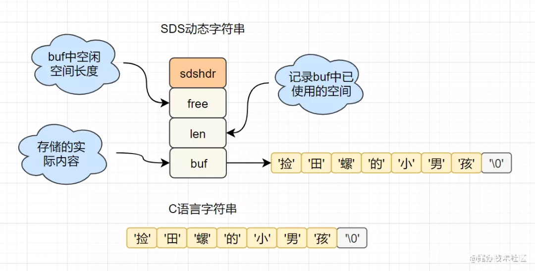 - 惰性空间释放:SDS 缩短时,不是回收多余的内存空间,而是free记录下多余的空间,后续有变更,直接使用free中记录的空间,减少分配。