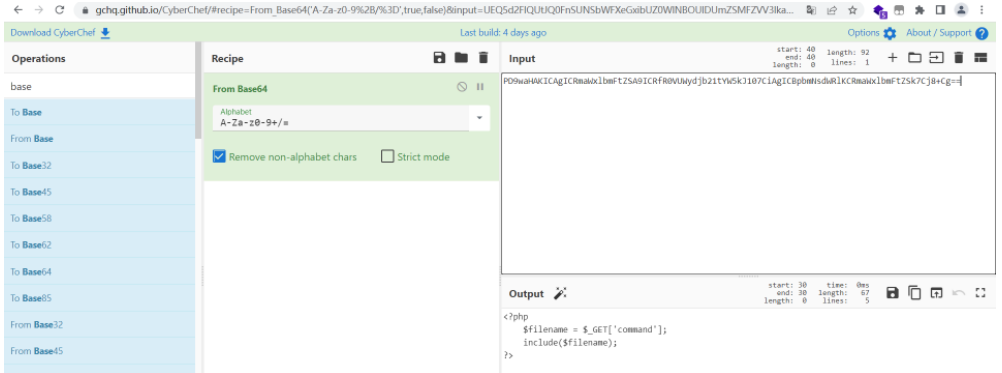 ②将回显的base64编码,利用cyberchef的From base64功能,将编码还原成代码(也可使用Burp的Decode功能):通过代码审计发现,确实存在文件包含漏洞