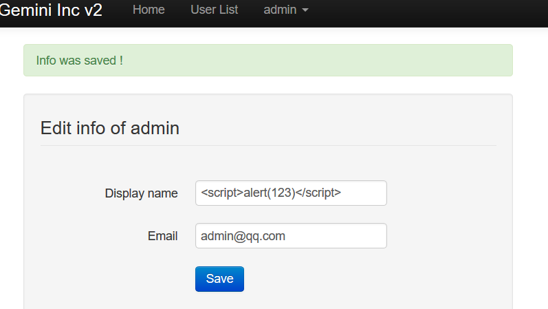 8)登录后台,通过修改当前用户得配置,检测是否还存在XSS漏洞,发现输入得js代码原样得输出到了页面上,而没有显示弹出,说明xss漏洞已修复