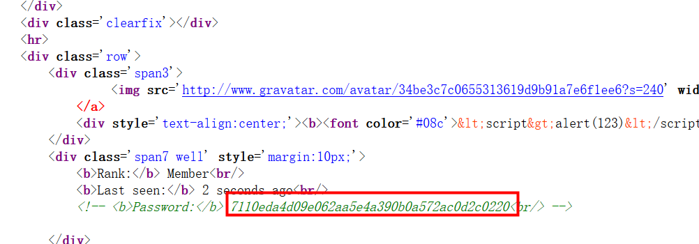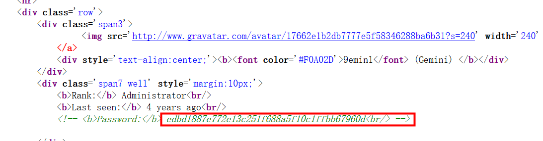①同时查看当前用户信息页面的源代码,发现存在一行password字段,根据字段字符类型,可初步判断是sha1算法进行加密