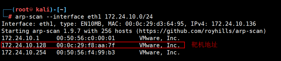 注:因虚拟机重新安装,网卡地址发生变化,kali主机IP地址为172.24.10.136,目标靶机IP地址为172.24.10.128