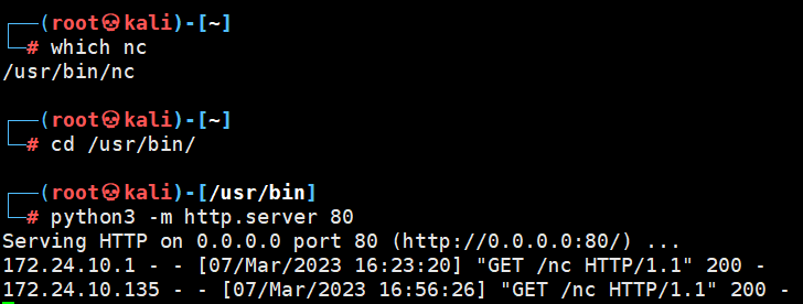 ⑤目标靶机通过nc侦听的方式接受kali主机传输的公钥文件