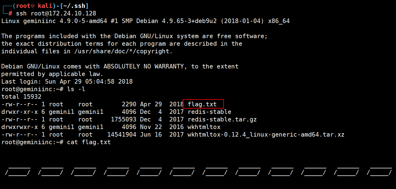 16)在kali主机通过ssh直接登录目标靶机的root账号,获取到flag