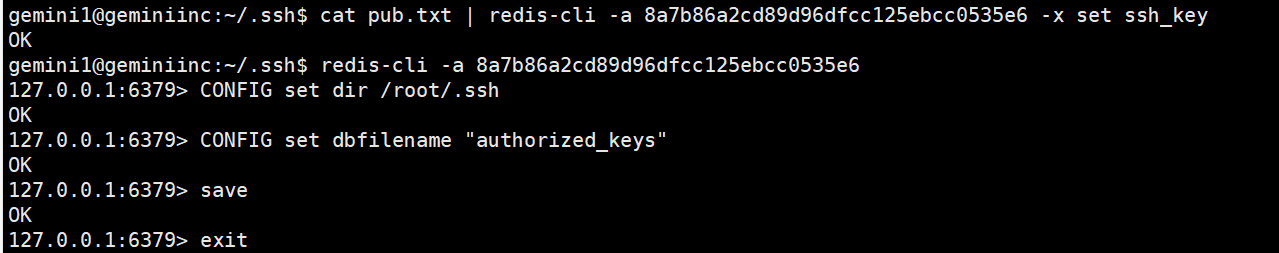 $ cat pub.txt | redis-cli -a 8a7b86a2cd89d96dfcc125ebcc0535e6 -x set ssh_key