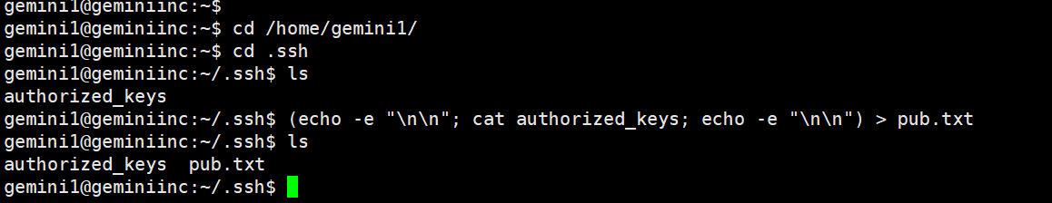 $ (echo -e "\n\n";cat authorized_keys; echo -e "\n\n") >pub.txt