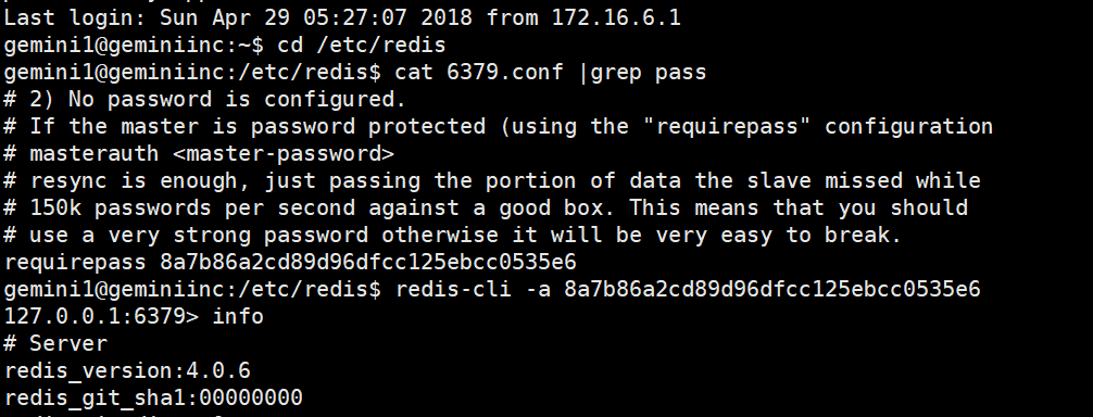 $ redis-cli -a 8a7b86a2cd89d96dfcc125ebcc0535e6