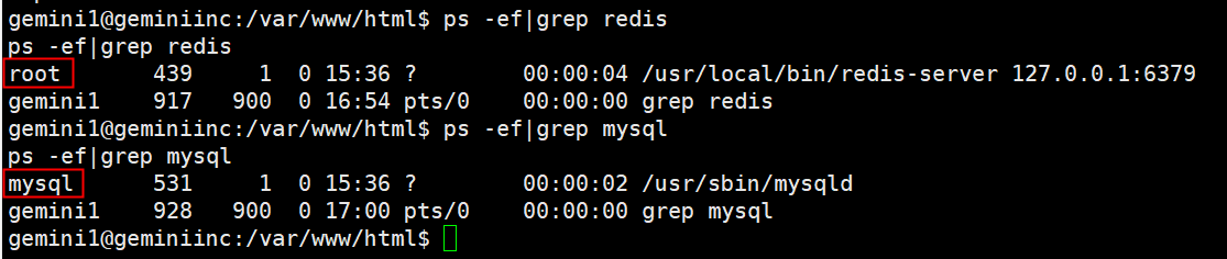 通过查看redis的进程服务发现,redis是由root账号启动的,mysql服务是由mysql账号启动的