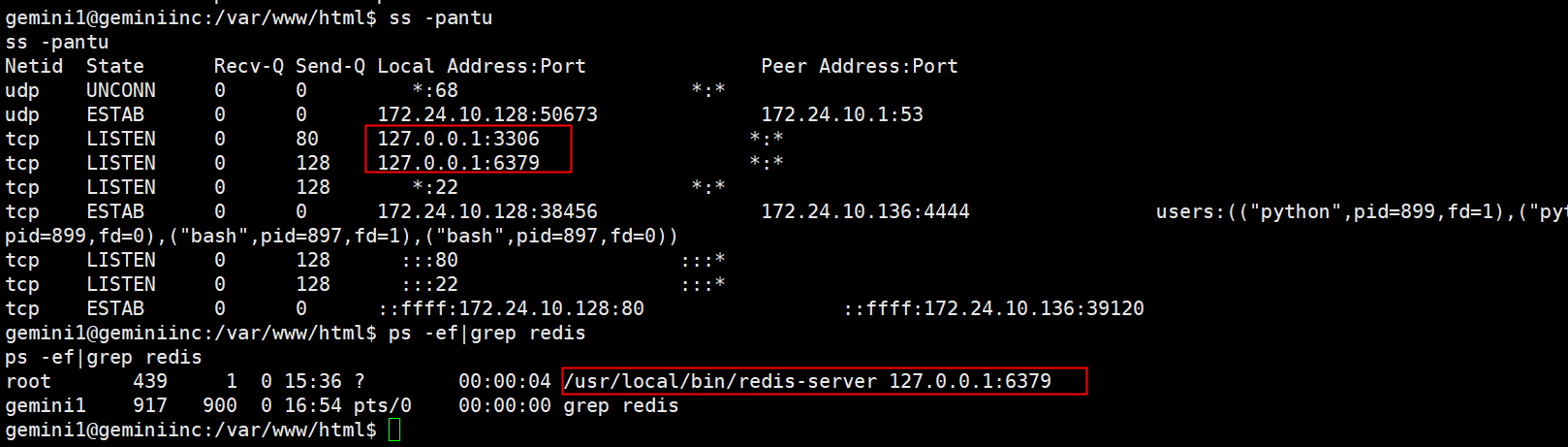 ②通过检查本机端口,发现在靶机上开放了3306和6379端口。默认情况下3306为mysql数据库的默认端口,6379为redis的默认端口(默认情况下运行redis服务的账号权限都很高,且默认情况下redis是未设置密码的,并且所有人都可以连接redis数据库)