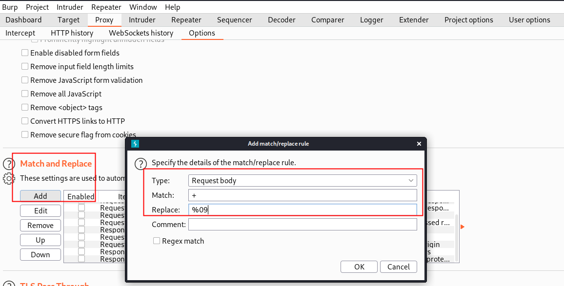 检查发现,对输入的字符进行了过滤,输入空格后会进行过滤,抓包后,将空格通过%09进行替换,转发数据包后,成功支持(%09就tab输入的字符)。说明此处空格字符被过滤