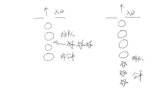 如果线程之间是有优先级的,那么线程调度的时候总是会倾向于满足高优先级的线程。也就说是,对于同一个资源的分配,是不公平的!如图所示,显示了非公平与公平两种情况(五角星表示高优先级线程)。对于非公平的锁来说,系统允许高优先级的线程插队。这样有可能导致低优先级线程产生饥饿。但如果锁是公平的,满足先来后到,那么饥饿就不会产生,不管新来的线程优先级多高,要想获得资源,就必须乖乖排队。那么所有的线程都有机会执行。